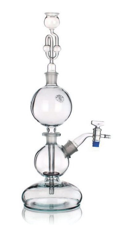 - Při otevřeném kohoutku nalijte kyselinu HCl 1:1 do ½ spodní části přístroje a dále při uzavřeném kohoutku přilijte další množství HCl 1:1 do ½ vrchní části přístroje.