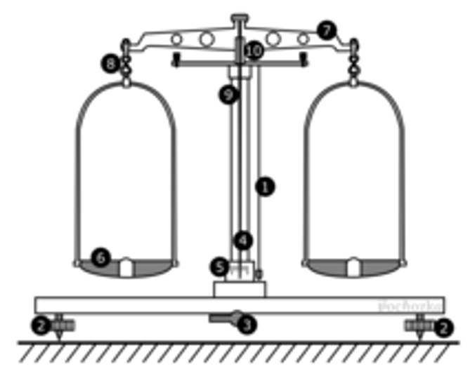 - Váhy se zavěšenými baňkami vyvažte a poté zaaretujte.